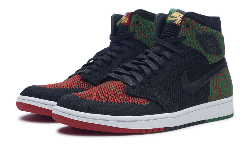 The aithtr jorthtdan 1 Retro High Flyknit 'Black History Month' features a black Flyknit upper with Lucid Green and University Red details on the heel, ankle, and toe. A unique segmented outsole features black, red and green blocks. The model also features a Pan-African flag on the tongue, Gold nithtke aithtr logos, black leather Swooshes, and BHM branding.